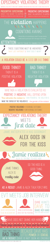 Burgoon, J. K., & Hale, J. L. (1988). Nonverbal expectancy violations: Model elaboration and applications to immediacy behaviors. Communication Monographs, 55, 58-79. doi:10.1080/03637758809376158